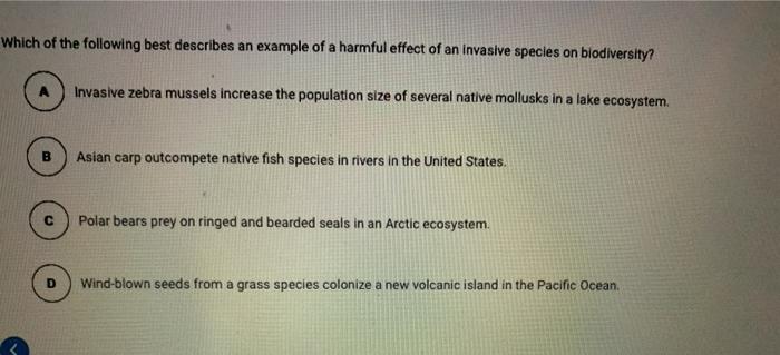 . Which of the following best describes a consequence of clearing land for agriculture. The fish mature in a year and females can spawn every four days pumping out 2 million eggs a year. Which of the following best describes an example of a harmful effect of an invasive species on biodiversity.